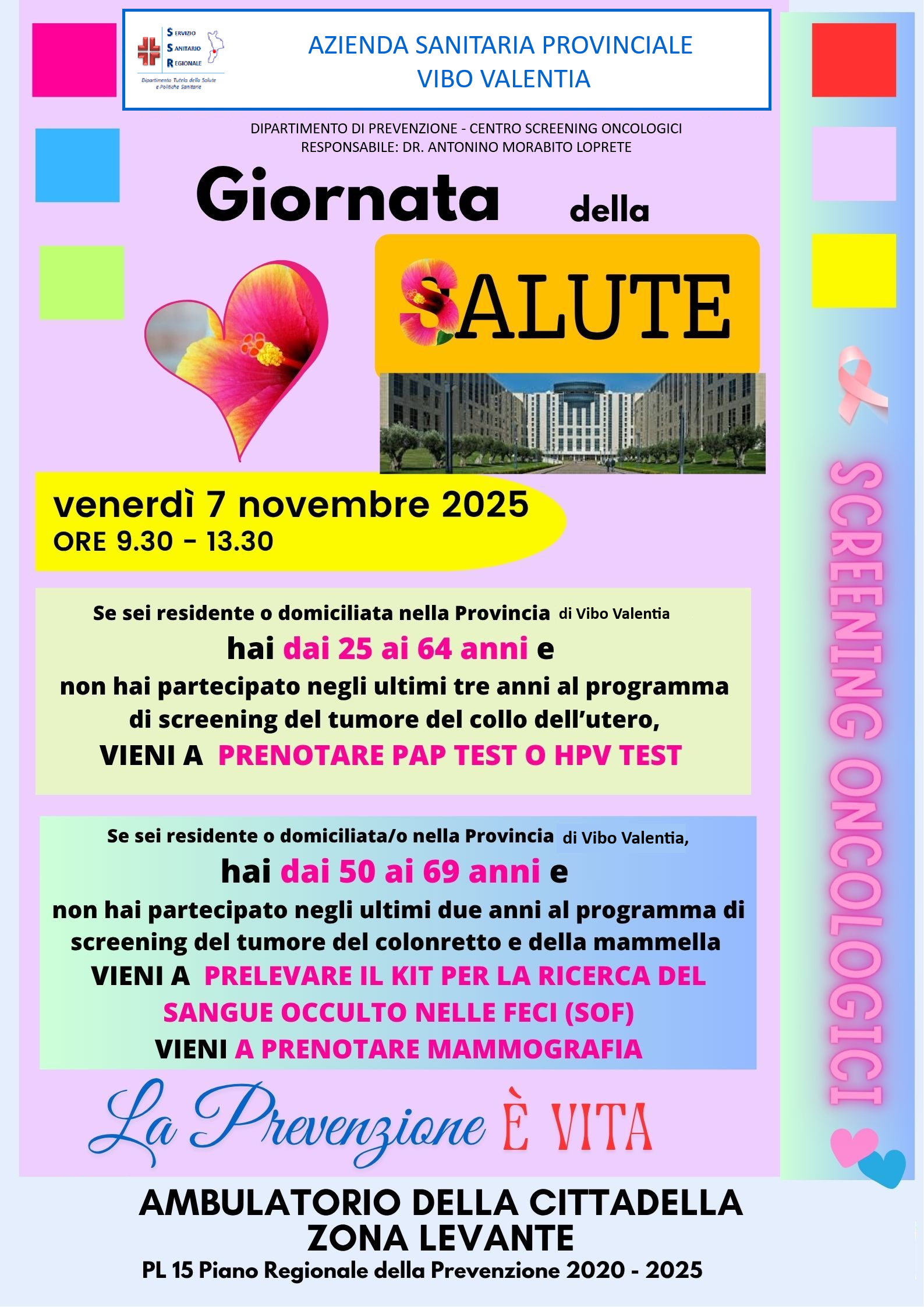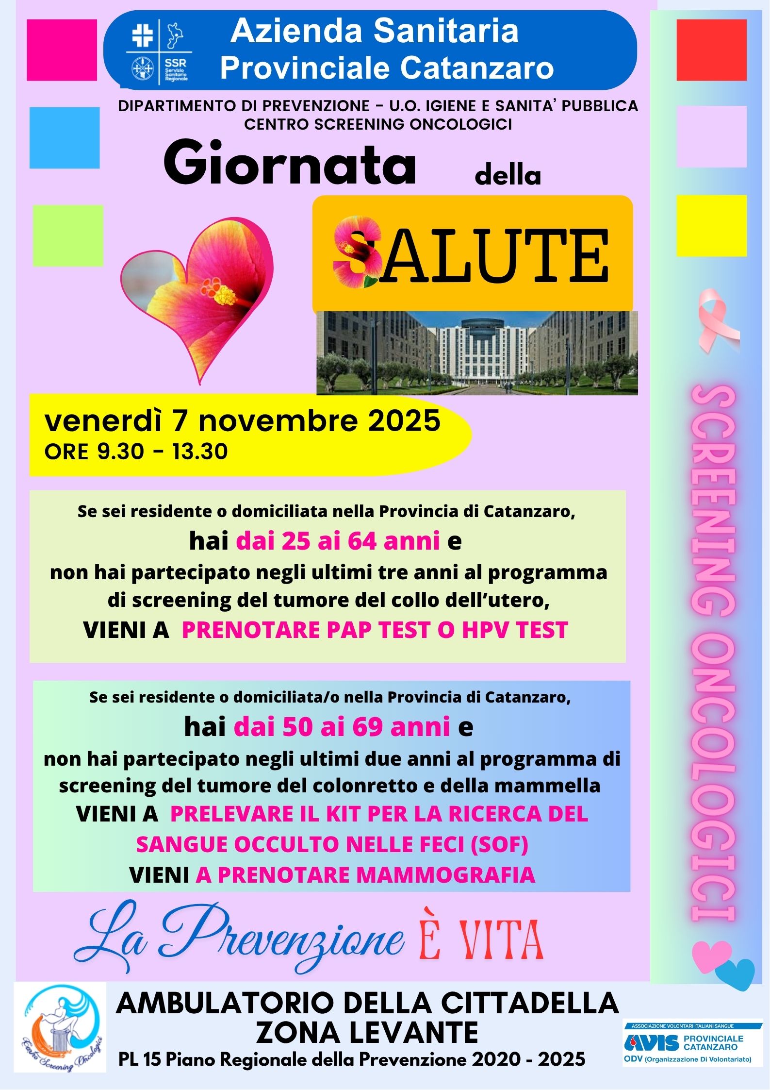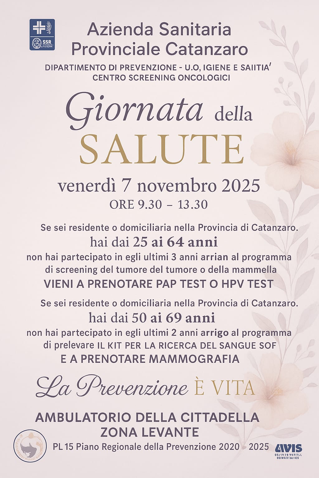 Si informa che nella giornata di venerdì 7 novembre, presso l’Ambulatorio della Cittadella Regionale, si terrà la Giornata della Salute, un’iniziativa dedicata alla promozione degli screening gratuiti per i dipendenti regionali.